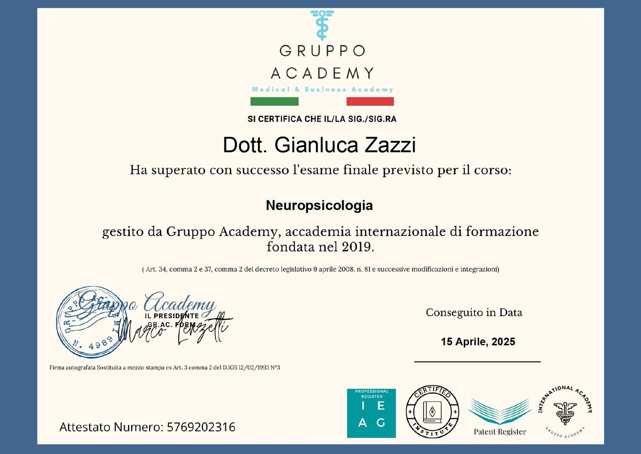 Il Dott. Zazzi è stato una vera scoperta. Fin da subito, la sua calma ed empatia mi hanno fatto sentire a mio agio. Le sue tecniche, davvero uniche e personalizzate, hanno fatto la differenza. Non sono le solite cose: mi hanno aiutato a sbloccare situazioni e a vedere le cose in modo nuovo. Grazie a lui, ho trovato strumenti preziosi e un calore umano che rendono il percorso non solo efficace, ma anche profondamente confortante. Lo consiglio a chi cerca un professionista competente e un approccio che funziona davvero.